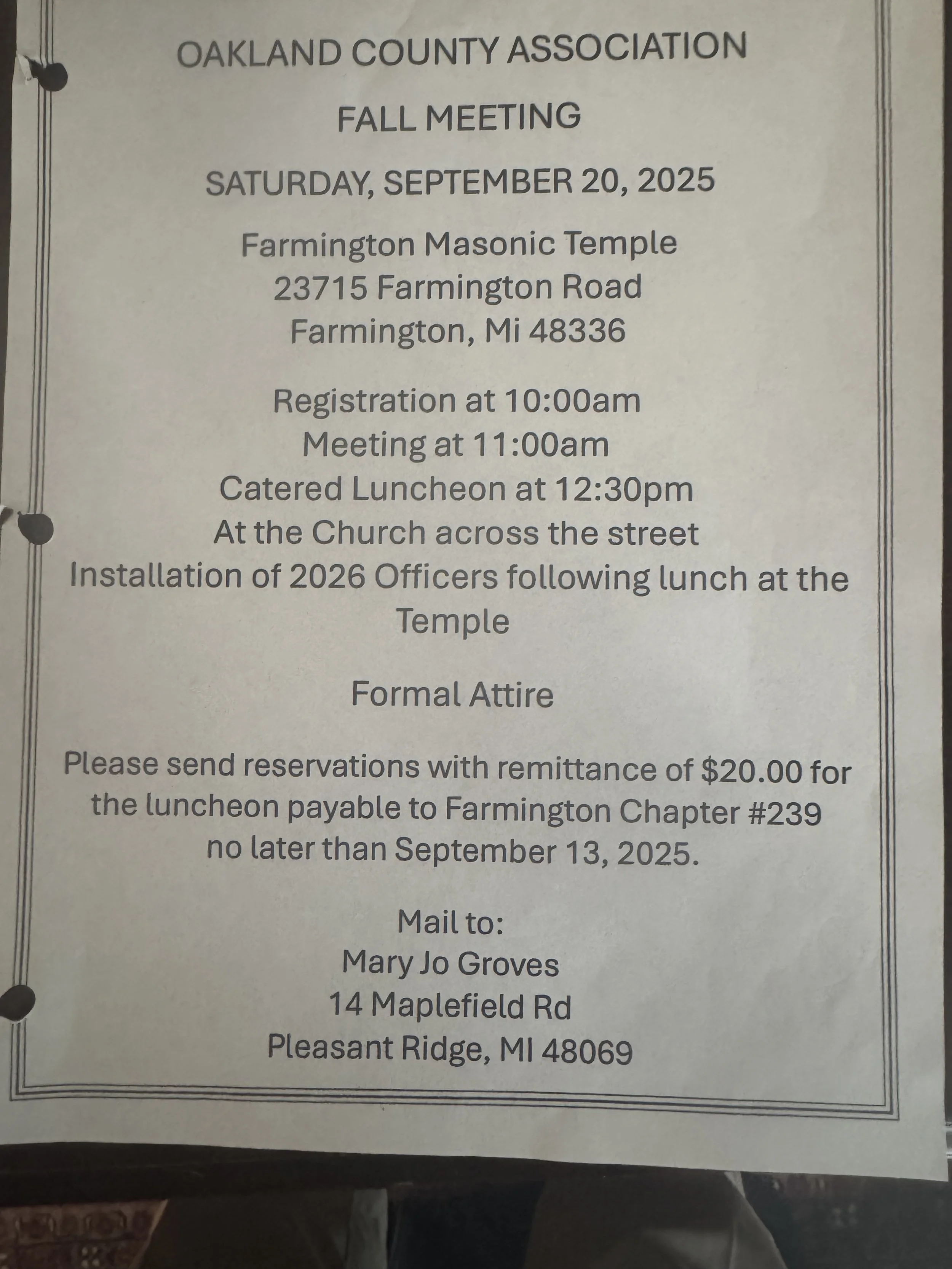 RSVP with payment of $20.00 payable to Farmington Chapter #239 no later than September 13, 2025 to Mary Jo Groves, 14 Maplefield Rd., Pleasant Ridge, MI 48069